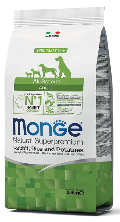 Monge Natural Superpremium Speciality Line Adult con Coniglio, Riso e Patate sono un alimento completo e bilanciato per cani adulti di tutte le razze che necessitano di alimenti ad alta digeribilità