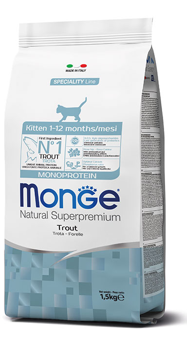 Monge Natural Superpremium Monoprotein* Kitten Trota è un alimento completo e bilanciato per gattini