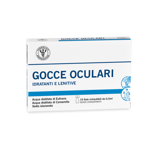 Idratanti e lenitive Gocce oculari in pratiche fiale richiudibili sterili contenenti acque distillate di Camomilla ed Eufrasia arricchite con sodo ialuronato.